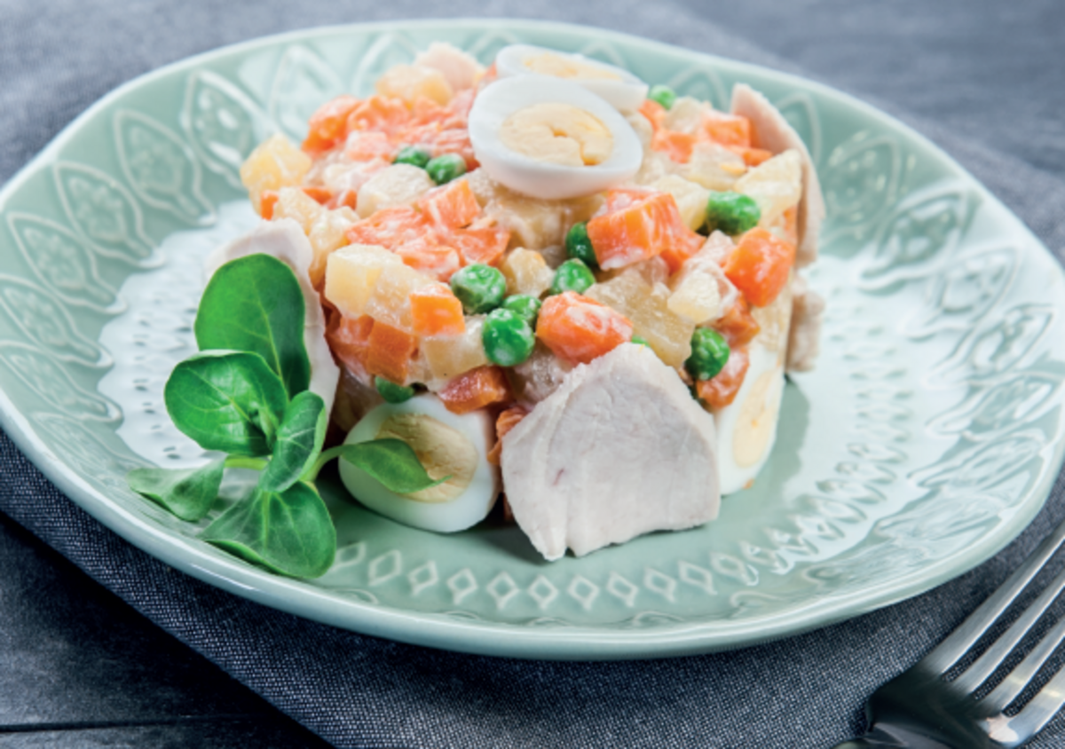 7. Дайте готовым овощам остыть, добавьте соль и перец по вкусу и перемешайте с огурцами, горошком, измельчёнными яйцами. Заправьте майонезом и подавайте.