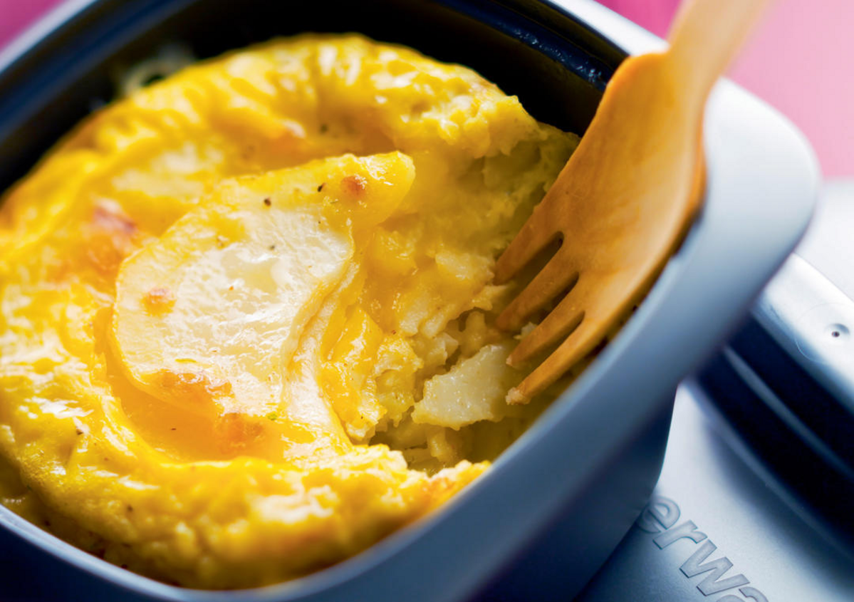 Распределите картофель по 4 кокотницам «УльтраПро™» и добавьте по 5 мл оливкового масла.