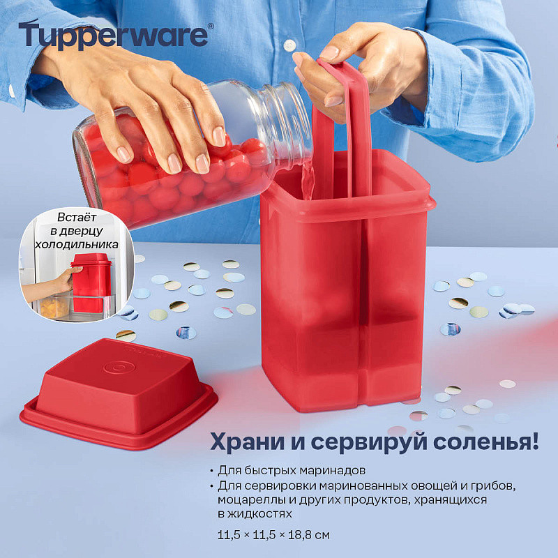 «Деликатесница» предназначена для хранения маринованных огурцов, грибов, помидоров, оливок, свежей моцареллы и других продуктов, которые следует хранить в рассоле.