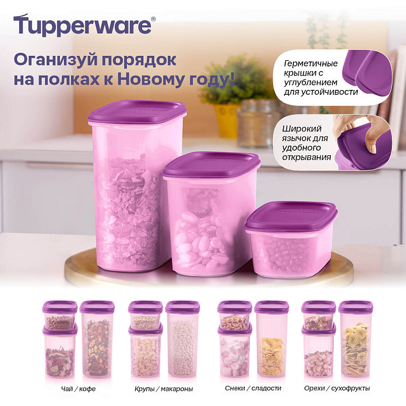 Герметичные крышки гарантируют сохранение свежести продуктов и защиту сыпучих продуктов от вредителей.