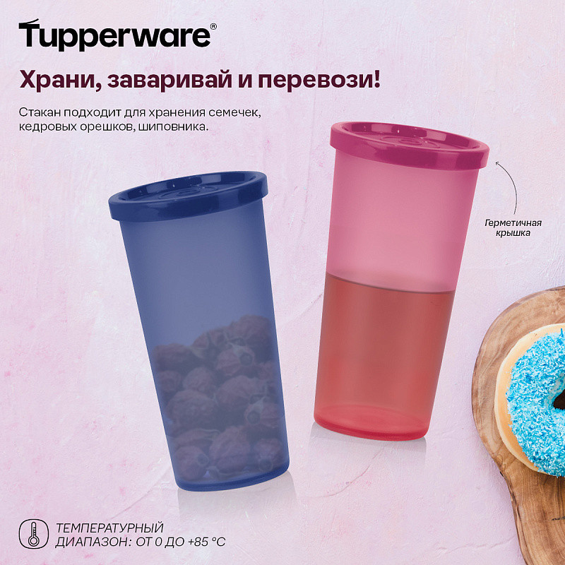 Стакан имеет влаговоздухонепроницаемую крышку, которая гарантирует сохранение свежести продуктов и безопасную транспортировку.